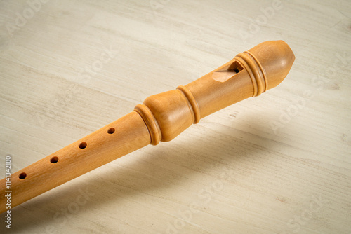Naklejka premium wooden recorder flute instrument, classic German style, against wood