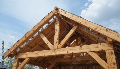 Fototapeta premium Wooden roof structure construction site architectural detail outdoor upward view craftsmanship