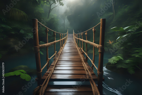© indofootage, Obraz premium Wooden rope bridge in the rainy tropical jungle
