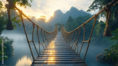 Obraz premium Wooden rope bridge through misty jungle at sunrise
