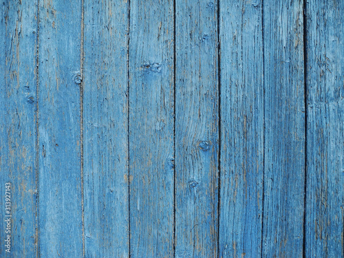 © Yana Bo, Naklejka premium Wooden rough planked wall, blue background
