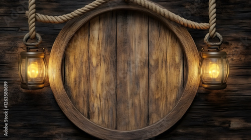 Fototapeta premium Wooden round frame with lanterns and rope on rustic wooden background