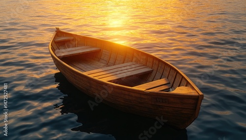 © Lem, Obraz premium Wooden Rowboat on Calm Water at Sunset