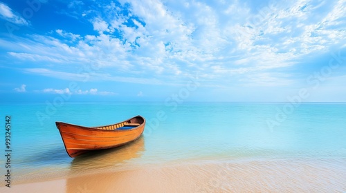 Naklejka premium Wooden Rowboat on Tranquil Turquoise Coastal Waters under Sunny Skies