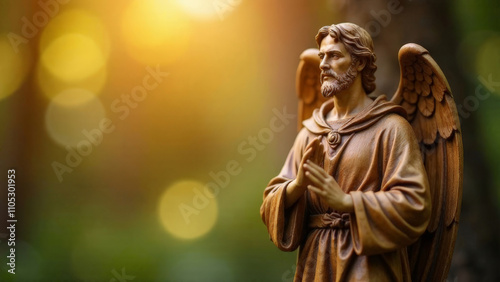 © OLGA RA, Fototapeta premium Wooden Saint Archangel Michael on blurred background.