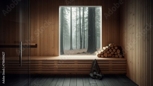 © Md Mojammel, Fototapeta premium Wooden sauna interior with steam coming out of the window.