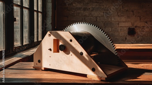 © Prism Trail, Obraz premium Wooden Saw with Large Metal Blade on Wooden Workbench in Rustic Workshop