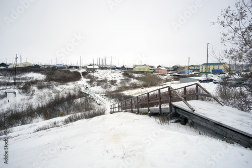 Obraz premium Wooden sidewalk in the village of Taz . Yamal Peninsula.
