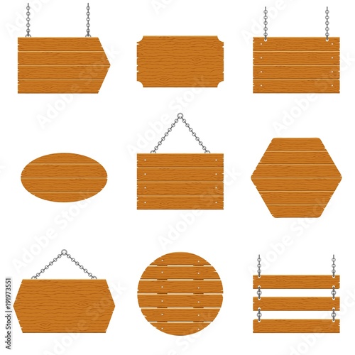 © photoplotnikov, Naklejka premium Wooden signboards and wood plank set isolated on white background. Signs and symbols to communicate a message on street, emblems of signages. Banner template with wood texture. Vector illustration