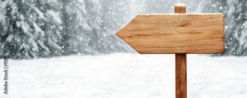 © Apaporn, Naklejka premium Wooden signpost blank canvas in snowy landscape, surrounded by evergreen trees, offering a wintery perspective, perfect for directional prompts.