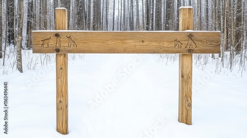 Naklejka premium Wooden signpost marking a winter trail through a serene, snow-covered forest...