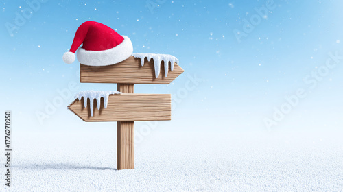 Fototapeta premium Wooden signpost with snow and icicles, topped with a festive red Santa hat, against a serene winter landscape, creating a cheerful holiday atmosphere