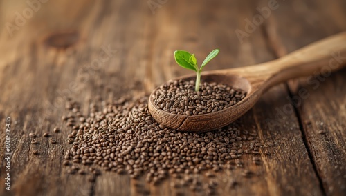 Fototapeta premium wooden spoon with chia seeds and sprouting plant