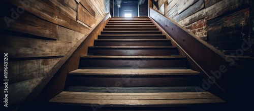 Fototapeta premium Wooden staircase ascending through rustic vintage architecture with illuminated passageway at the top creating an inviting atmosphere