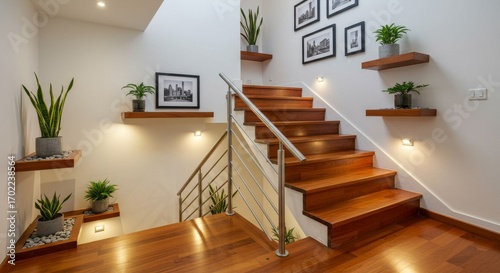 © syukri, Obraz premium Wooden Staircase with Floating Shelves, Green Plants, and Framed Cityscape Photography under Warm Ambient Lighting