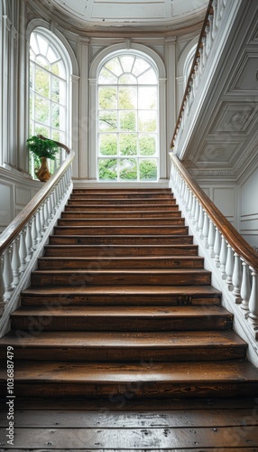 © boler, Fototapeta premium Wooden Staircase with White Banisters and a Window View