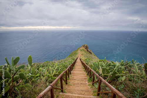 Obraz premium Wooden steps path from Cristo Rei statue to the ocean cape.