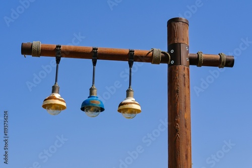 Fototapeta premium Wooden street lamppost with hanging three vintage weathered rusty lamp bulb lantern in trendy eco style on background of blue sky during day