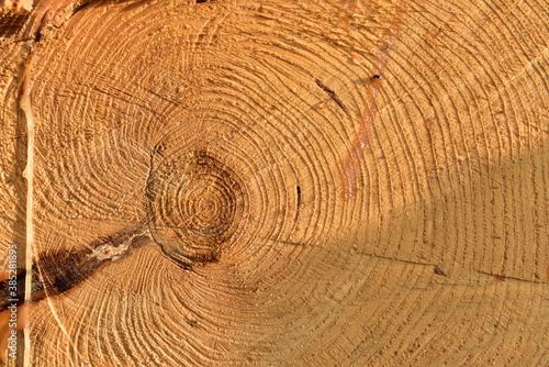 Naklejka premium Wooden structure. Cross sectional cut end of log showing the pattern and texture created by the growth rings. Section through trunk of the wood. Annual ring on a sawn through tree.
