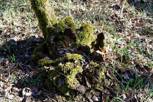 © Didi, Obraz premium Wooden stump with moss in spring forest, good for meditation and mind cleaning