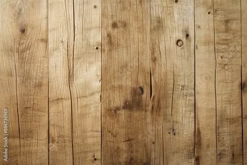 © miss irine, Naklejka premium Wooden surface with knots and cracks texture. Close-up view of wooden board with brown color. Imperfections add depth to smooth wood. Blurred background focuses on wooden texture.