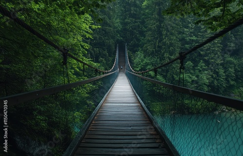 © LyceeChee, Fototapeta premium Wooden suspension bridge crossing a lush green forest