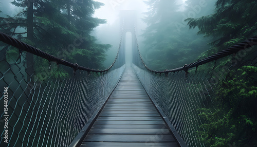 © Oleksiy, Fototapeta premium Wooden suspension bridge. Misty atmosphere, way through clouds, path between mountain rocks. Travel destination