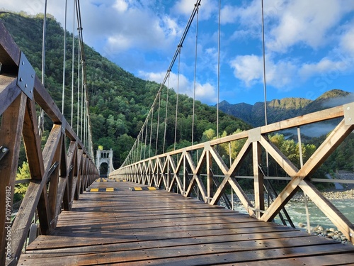 © Guy, Obraz premium Wooden suspension bridge over the river in the mountains. Beautiful landscape.