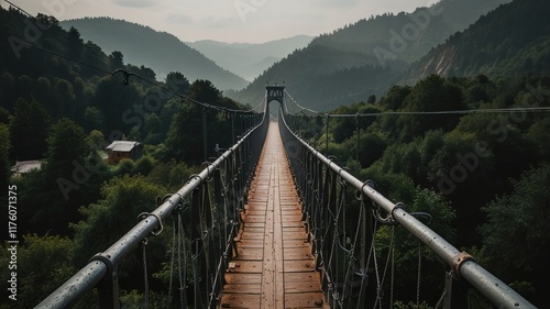 Obraz premium Wooden suspension bridge spanning a valley with lush green forest and...