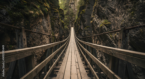 © LarisManis, Fototapeta premium Wooden suspension bridge through gorge