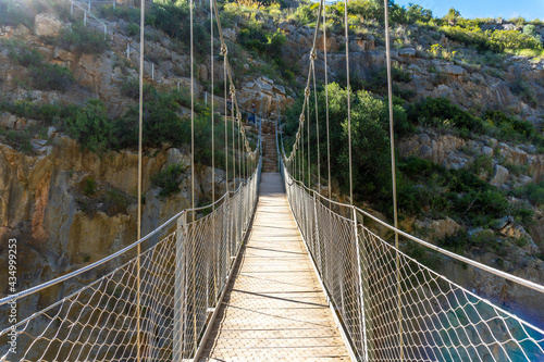 © unai, Obraz premium Wooden suspension bridges in the Loriguilla reservoir. Ruta de los Pantaneros in the town of Chulilla in the Valencian community. Spain