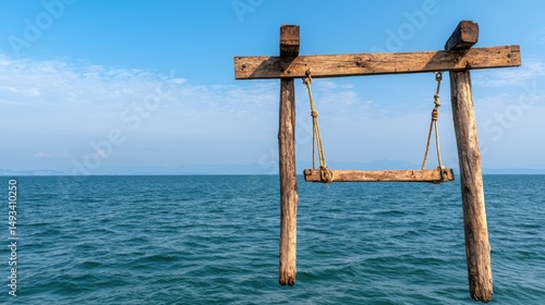 Naklejka premium Wooden swing hanging from a rustic frame over calm blue ocean waters under a clear sky