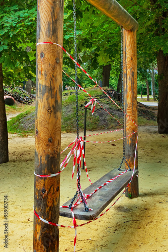 © Vlad Kazhan, Fototapeta premium Wooden swing on chains on empty playground in park. White and red warning tape. Prohibited to use