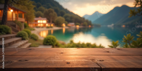 © Anuyj, Naklejka premium Wooden table, blurred river lake background