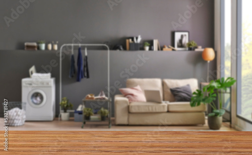 © UnitedPhotoStudio, Fototapeta premium Wooden table close up and decorative grey room background style, blur detail.