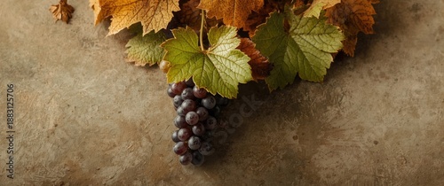 © AkuAku, Obraz premium Wooden table featuring a grape wrapped in vine leaves, flat lay with empty space