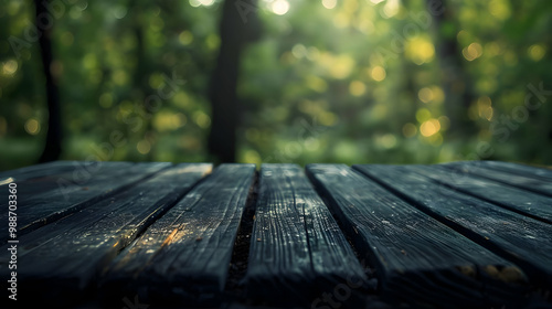Fototapeta premium Wooden Table in a Sunlit Forest Nature Photography