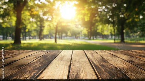 © hugy, Fototapeta premium Wooden table in a sunny green park, perfect for picnics and outdoor activities with a scenic nature backdrop