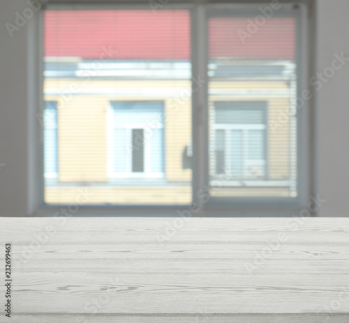 Fototapeta premium Wooden table in front of window with shutters indoors