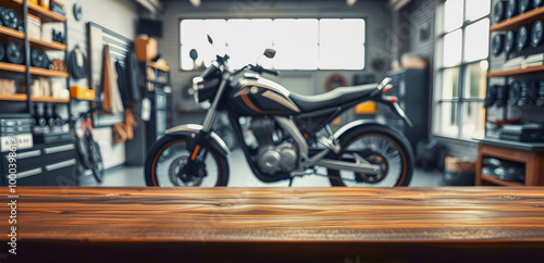 Fototapeta premium Wooden table in garage with motorcycle background.