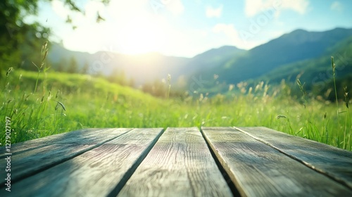 © gentho, Fototapeta premium Wooden table in sunny mountain meadow.