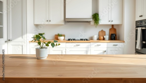 © Husen, Fototapeta premium wooden table, kitchen interior, white cabinets, marble countertop, potted plants