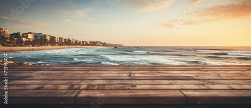 Naklejka premium Wooden table ocean bokeh background, empty wood desk surface product display...