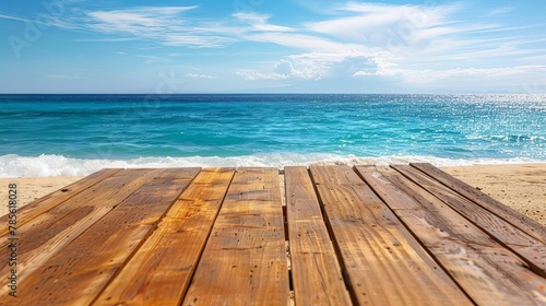 © Bijac, Fototapeta premium wooden table on beach with ocean water next to it tropical vacation and relaxation concept travel photography