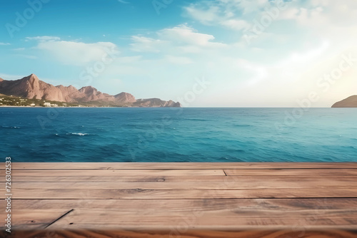 © Sonya, Naklejka premium Wooden table on the background of the sea, island and the blue sky. High quality photo