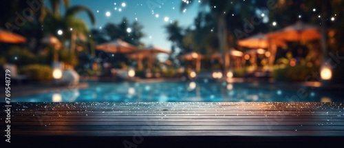 © Synthetica, Naklejka premium Wooden table pool bokeh background, empty wood desk product display mockup with blurry tropical hotel resort abstract poolside summer travel backdrop advertising presentation. Mock up, copy space .