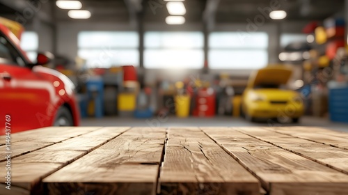 Obraz premium Wooden Table Surface in Auto Repair Shop with Blurred Background and Colorful...
