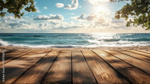 Fototapeta premium Wooden table top with a blurred tropical beach background for product display presentation