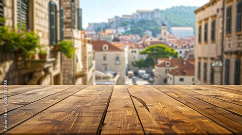 © Irina Ukrainets, Fototapeta premium Wooden table top with blurred European old town view in background.