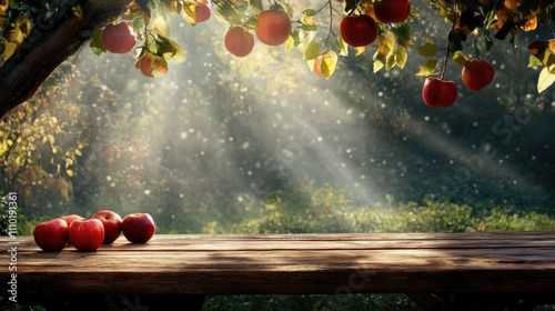 © AbstractAI, Naklejka premium Wooden table with apples under tree branches in a sunlit orchard ideal for product display and seasonal marketing themes
